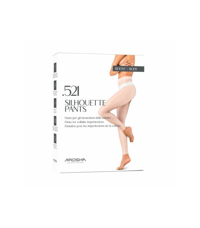 Arosha .521 Silhouette Pants é um tratamento cosmético formulado para combater as imperfeições causadas pela celulite, mesmo a um nível avançado. A sua fórmula contém um inovador sistema de fornecimento que encapsula a fosfatidilcolina que, graças às suas propriedades, consegue dissolver a gordura ao reduzir o tamanho dos adipócitos. Associada à Cafeína e Carnitina, promove o metabolismo dos ácidos gordos, favorecendo a sua conversão em energia e combate a sua acumulação no tecido adiposo. A sua fórmula é ainda enriquecida com a enzima colagenase que promove a rutura dos feixes de colagénio amorfo que, ao comprimir as células adiposas, contribuem para a formação de nódulos fibrosos. 1 Calças + 1 Recarga